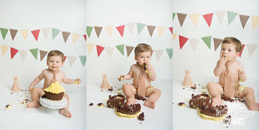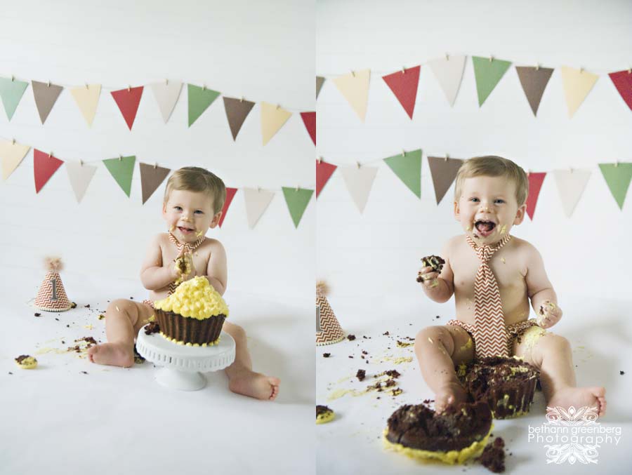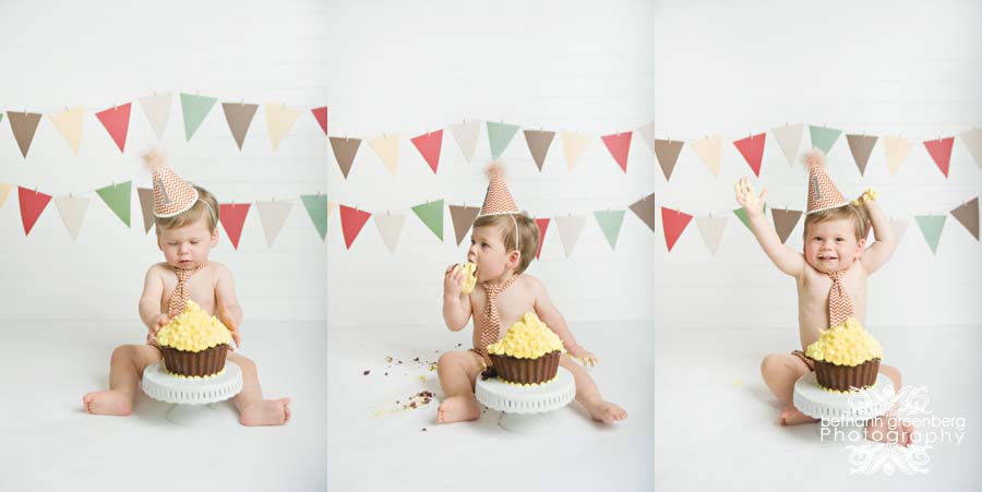 During this session Ben was one year old! We celebrated his one-year session, as I do with most of my clients, with a smash cake session! I have never seen a kid enjoy cake as much as this guy! A smash cake session can be hit or miss. Some kids enjoy getting messy and some cry the whole time, but Ben thoroughly enjoyed it! He would pick up fistfuls of cake and try to put the whole piece in his mouth. Even after we were done and took away the cake, he looked for crumbs to eat off the paper! A sweet boy with a sweet tooth!